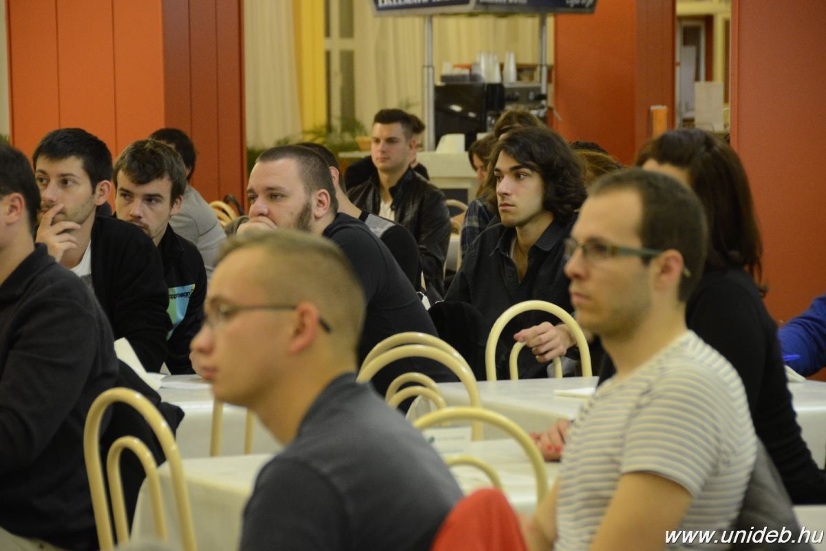 – Hogyan legyél sikeresebb azoknál a kortársaidnál, akik nincsenek itt a teremben? – ezzel a provokatív kérdéssel kezdte előadását, Süvöltős László, a Fiatal Vállalkozók Országos Szövetségének (FIVOSZ) megyei alelnöke. Akkora volt az érdeklődés a rendezvény iránt, hogy a szervező Technológia- és Tudástranszfer Központnak át kellett tennie a programot a pizzériából a menzára.