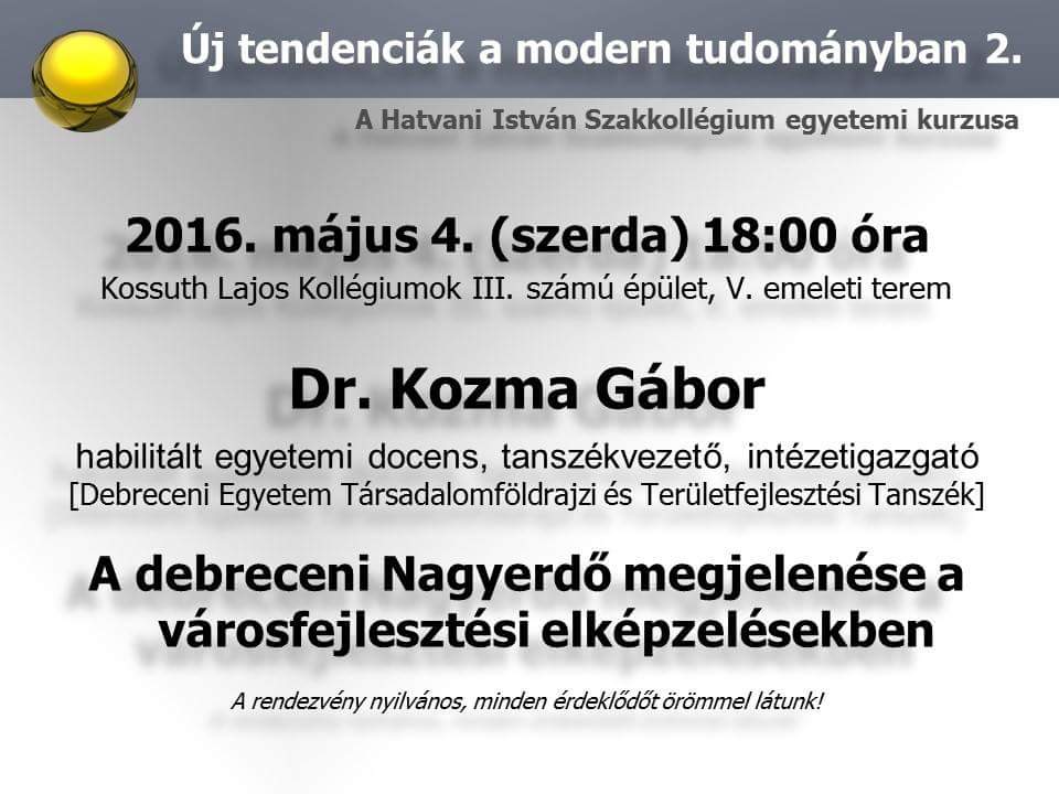 A Debreceni Nagyerdő és a városfejlesztés Egyetem május 3, 2016Szabolcs SzilágyiSzóljon hozzá a A Debreceni Nagyerdő és a városfejlesztés bejegyzéshez Kozma Gábor előadása a Hatvani István Szakkollégiumban.