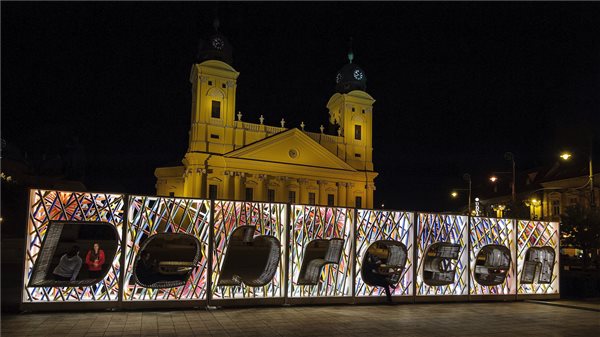 A város nevének betűiből álló, fából készült utcabútor a református nagytemplom előtt a debreceni Kossuth téren 2016. szeptember 22-én. MTI Fotó: Czeglédi Zsolt