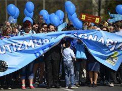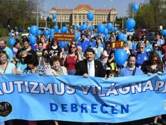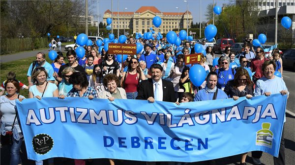 Az első alkalommal megrendezett debreceni Kék séta résztvevői az autizmus világnapján, 2017. április 2-án. MTI Fotó: Czeglédi Zsolt.