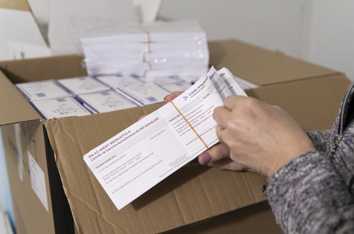 Szabó Tünde megyei tisztifőorvos ellenőrzi az AstraZeneca újonnan érkezett koronavírus elleni vakcináihoz tartozó oltási kártyákat a Szabolcs-Szatmár-Bereg Megyei Kormányhivatal Népegészségügyi Főosztályának hűtőkamrájában 2021. március 17-én.