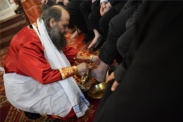 Kocsis Fülöp, a hajdúdorogi görögkatolikus főegyházmegye érsek metropolitája egy férfi lábát mossa a nagycsütörtöki szent liturgián a debreceni Istenszülő Oltalma Görögkatolikus Főszékesegyházban 2017. április 13-án. A lábmosás szertartás Krisztus tettére való emlékezés, aki az utolsó vacsorán szeretetének jeléül megmosta tizenkét tanítványának a lábát. MTI Fotó: Czeglédi Zsolt
