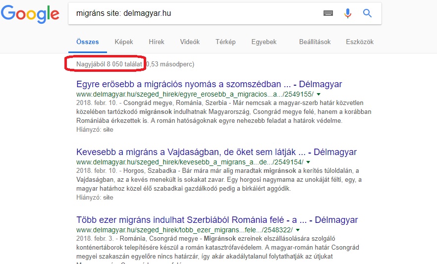 Az Átlátszó felmérése szerint a Google találatai szerint 2017. január elseje és 2017. március 19-e között mindössze 24 cikkben szerepelt a delmagyar.hu-n a “migráns” kifejezés. Ez 2018 azonos időszakában megváltozott. A Google szerint ennek többszöröse, közel 100. Ebben persze azok a kereszthivatkozott cikkek is benne vannak, melyeket a kereső összeköt a portálon belül.