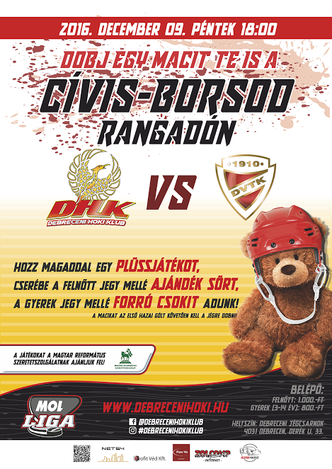 Immár hagyományos jelleggel repülnek idén is a macik a Debreceni Hoki Klub december 9-i, pénteki, DVTK Jegesmedvék elleni Cívis-Borsod Rangadóján! Az első hazai gól után bedobott plüssjátékok a Magyar Református Szeretetszolgálat gondozásában kerülnek majd kiosztásra hátrányos helyzetű gyermekek számára december 18-án.