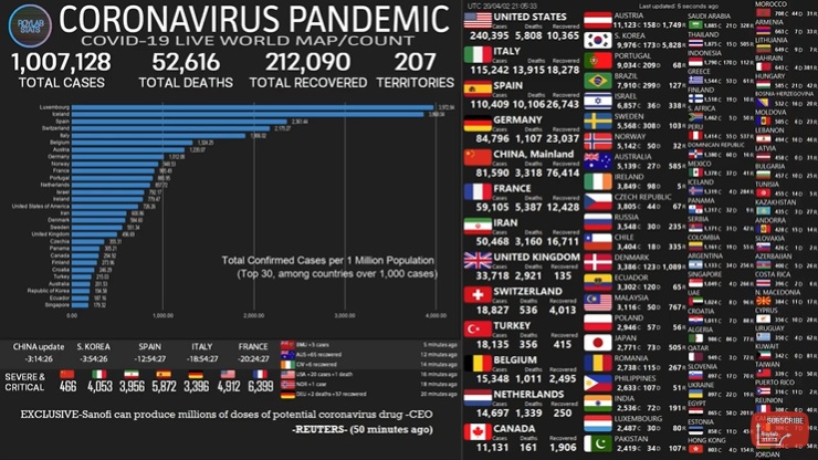 Meghaladta az egymilliót a koronavírusos személyek száma a Földön. Jelenlegi állás szerint a fertőzöttek egynegyede (240 ezer) az Egyesült Államokban él, 100 ezernél több személyt diagnosztizáltak a vírussal Olaszországban és Spanyolországban, 85 ezret Németországban, míg a hivatalos (és lehet, hogy nem igazán valós) adatok szerint Kínában csak 81 ezret.