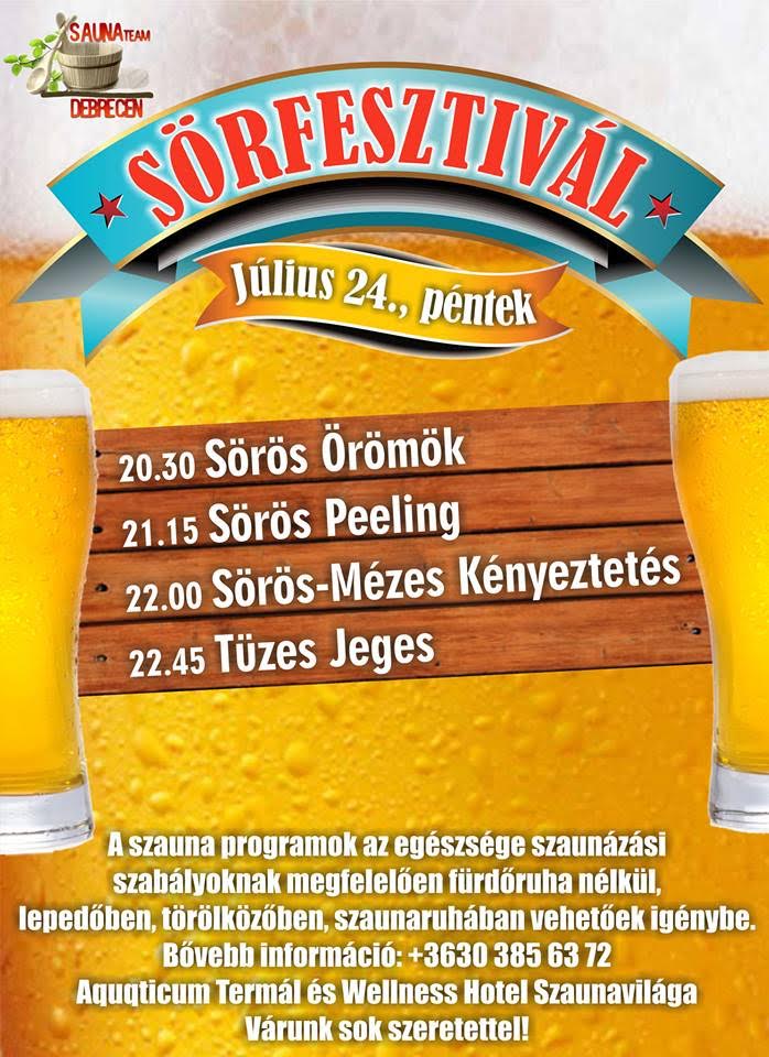 Péntek este bőrszépítő Sörfesztivál lesz az Aquaticum Szaunavilágban!Kezdés 20:30-kor egy citromos-búzasörös frissítő felöntéssel, a szomjas vendégek eközben alkoholmentes sörkoktéllal hűsölhetnek a szauna kályha partján, majd 21:15-kor barna sörös-tengeri sós peelinggel szabadulunk meg az elhalt hámsejtektől, 22:00-kor mézes-sörös pakolással kényeztetjük bőrünket. Az estét természetesen Dajka Tamás zárja 22:45-kor egy igazi tüzes-jegessel!