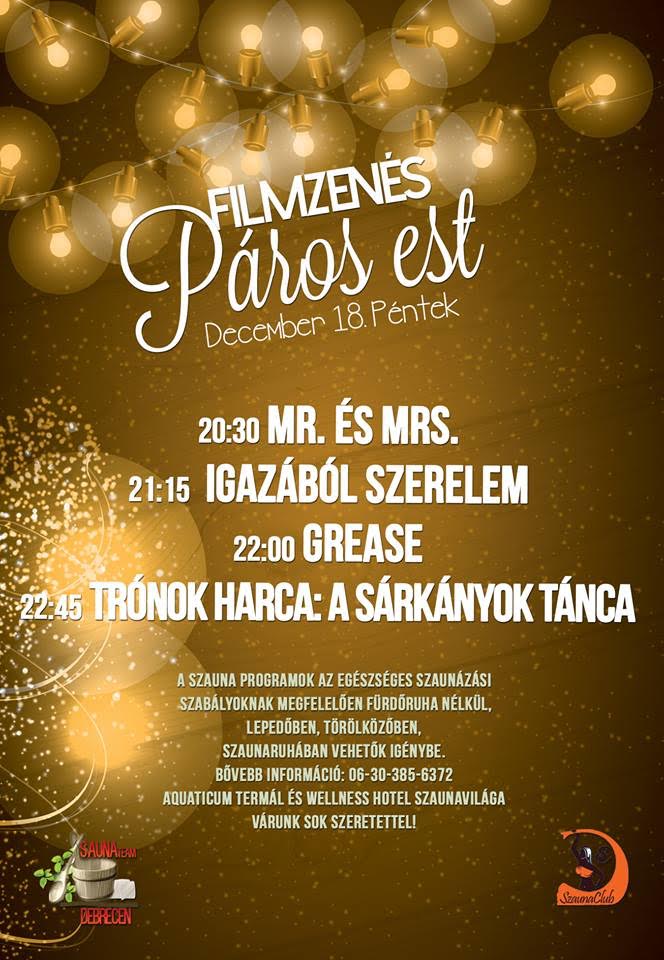 20:30-kor Peti és Bogi adja elő a Mr. és Mrs. című film szaunás feldolgozását.