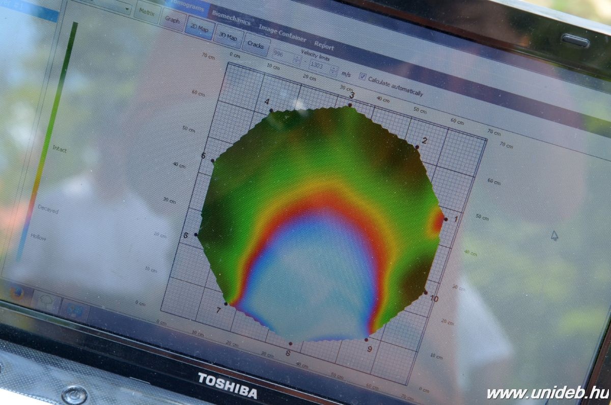 – Érzékelőket helyezünk fel a fa törzsére, majd kalapácsütéssel hangot keltünk. A műszer rögzíti a terjedési időket, és a keresztmetszeti hangsebesség-térképet állít össze, amelyből kiderül, hogy hol üreges a fa – mutatta be a készülék működését Dívós Ferenc fizikus szakértő.