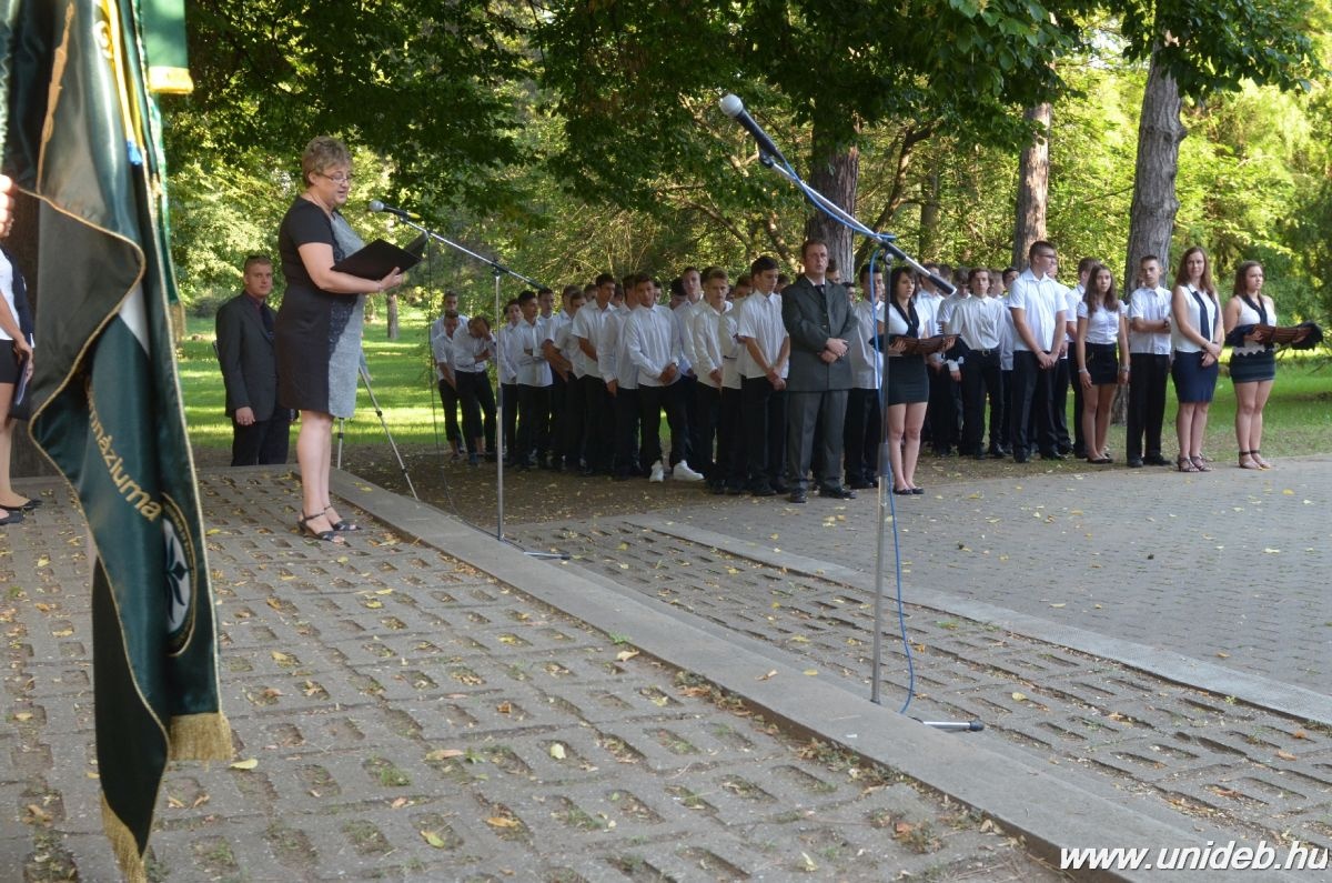 – Intézményünk 148 éve áll a nevelés-oktatás szolgálatában, s e jeles napon kezdődik meg a középfokú oktatás 75. tanéve. Az eltelt évek során a több mint 100 éves iskolaépület falai, parkunk fái, bokrai történelmi idők tanúi voltak. Iskolánk múltjában az örömteli, önbecsülésre okot adó események és tragikus fejezetek, mártírok, hírességek egyaránt fellelhetők. Tanulságaik, példáik máig hatnak, s utat mutatnak. Ezért napjaink egyik legfőbb pedagógiai feladata, hogy ébren tartsuk az érdeklődést nemes hagyományaink iránt, és tüzet élesszünk az új dolgok befogadására, a kultúra és a lélek gazdagítására – hangsúlyozta a keddi jubileumi tanévnyitón Kovács Árpádné igazgató.