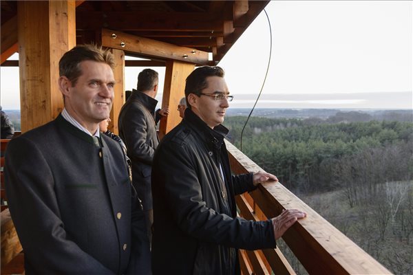 Szalacsi Árpád, a Nyírerdő Zrt. vezérigazgatója (b) és Papp László Debrecen polgármestere (j) a Debrecen melletti Erdőspusztán felépült hármashegyi kilátón 2014. december 4-én. A Zsuzsi erdei kisvasút végállomásánál lévő Hármashegyen a korábbi, elavult 14 méter magas kilátó helyett építették fel a 25 méter magas tornyot, amelynek a tetejére 101 lépcsőfok megmászásával lehet feljutni. A kilátóból a Bihari hegyek is jobban látszanak. Az új 25 méteres kilátó és a mézeshegyi tónál megépített tanösvény, valamint kerékpárút 171 millió forintból valósult meg.