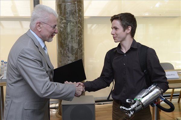 Pálinkás József, a Nemzeti Kutatási, Fejlesztési és Innovációs Hivatal elnöke, a Magyar Tudományos Akadémia (MTA) volt elnöke átadja a III. helyezettnek járó díjat Póka Károlynak, a Debreceni Református Kollégium Dóczy Gimnáziuma tanulójának a 24. Ifjúsági Tudományos és Innovációs Tehetségkutató Versenyen díjátadó és kiállításmegnyitó ünnepségén Budapesten, a Design Terminálban 2015. május 12-én. A versenyt és a díjátadó után a pályaművekből nyílt kiállítást a Magyar Innovációs Szövetség, az Emberi Erőforrások Minisztériuma (Emmi) és a Médiaszolgáltatás-támogató és Vagyonkezelő Alap (MTVA) szervezte. MTI Fotó: Soós Lajos