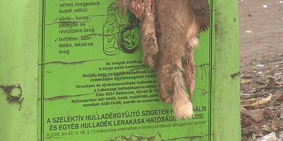 Valaki karácsony napján egy kizsigerelt őztetemet helyezett ki az egyik szelektív hulladékgyűjtő konténerére, Debrecenben – számolt be róla a dehir.huAz őztetemet azóta elszállították, a rendőrség pedig vizsgálja az ügyet. A debreceni tv tudósítása szerint ez nem az első eset volt, máskor már találtak elpusztult kutya és macskatetemet is, sőt egyszer döglött juhot is kirakott valaki a szelektív szigeteknél.