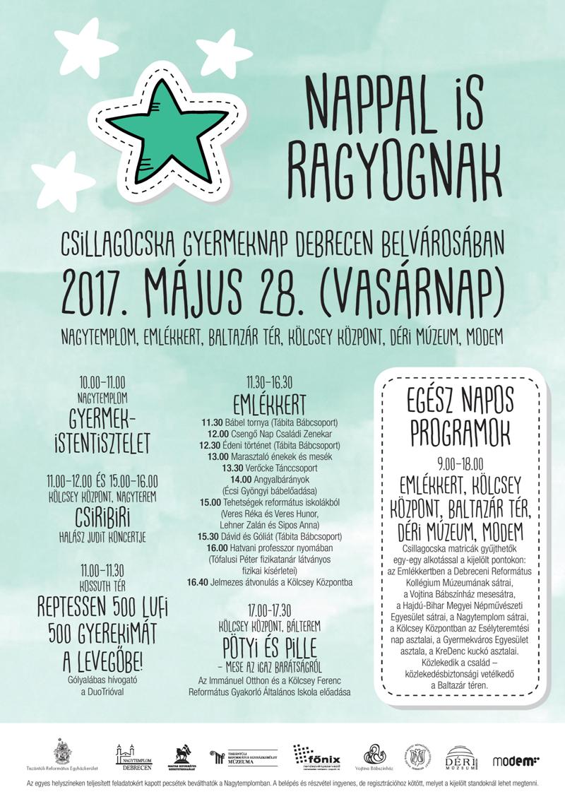 A Csillagpont református ifjúsági találkozó elnevezésére is utalva május utolsó vasárnapján rendezik meg Debrecen belvárosában a Csillagocska gyermeknap című programsorozatot, amelynek összeállításakor a reformáció 500 éves évfordulója apropóján kiemelt szerephez jutott a Magyarországi Református Egyház – közölték a szervezők szerdán sajtótájékoztatón a cívisvárosban.