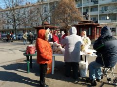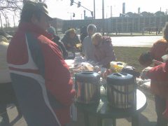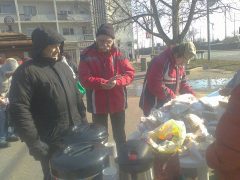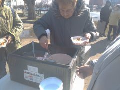 Az ingyenes ételosztáson egy tál meleg ebéddel, forró teával vártunk minden rászorulót. A metsző hideg (mínusz hét fok), a nagy szél ellenére jóval több mint száz embertársunk állt a sorban a töltött káposztáért, a friss kenyérért. A kegyetlen