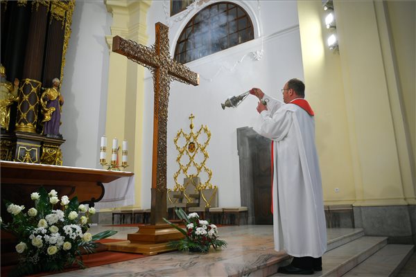 A Nemzetközi Eucharisztikus Kongresszus missziós keresztje a debreceni Szent Anna-székesegyházban 2018. május 30-án. A keresztet a 2020-as budapesti kongresszusig valamennyi egyházmegyébe elviszik.
