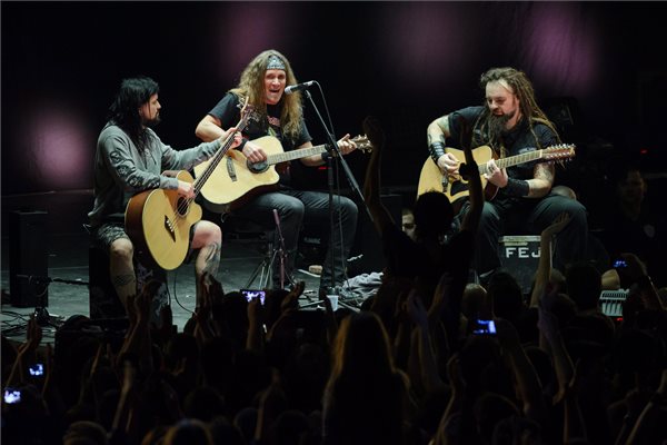 Fejes Tamás, Lukács László és Sidlovics Gábor (b-j), a Tankcsapda együttes tagjai az idén 25 éves zenekar jubileumi turnéjának évzáró nagykoncertjén a debreceni Főnix Csarnokban 2014. december 27-én. MTI, fotó: Czeglédi Zsolt
