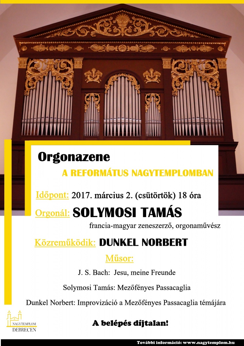 Március 2-án (csütörtökön) 18 órától Solymosi Tamás francia-magyar zeneszerző és orgonaművész ad ingyenes orgonakoncertet a Református Nagytemplomban. A műsorban Bach Jesu, meine Freunde című darabján kívül a zeneszerző saját műve is felcsendül.