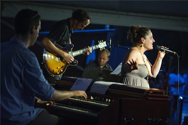 Vas Bence, Földi Gergely, Benkó Ákos és Bodoki Tünde (b-j), az Organism nevű zenekar tagjai a Debreceni Bor és Jazznapokon adott koncertjükön 2015. augusztus 8-án.