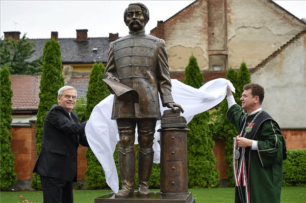Tőkés László, a Pro Universitate Partium Alapítvány Kuratóriumának elnöke (b) és Pálfi József, a Partiumi Keresztény Egyetem rektora felavatja Arany János teljes alakos szobrát az egyetem kollégiumának udvarán az intézmény tanévzáró ünnepsége után Nagyváradon 2017. június 17-én. A szobrot Mihály Gábor Munkácsy-díjas szobrászművész készítette. MTI Fotó: Czeglédi Zsolt