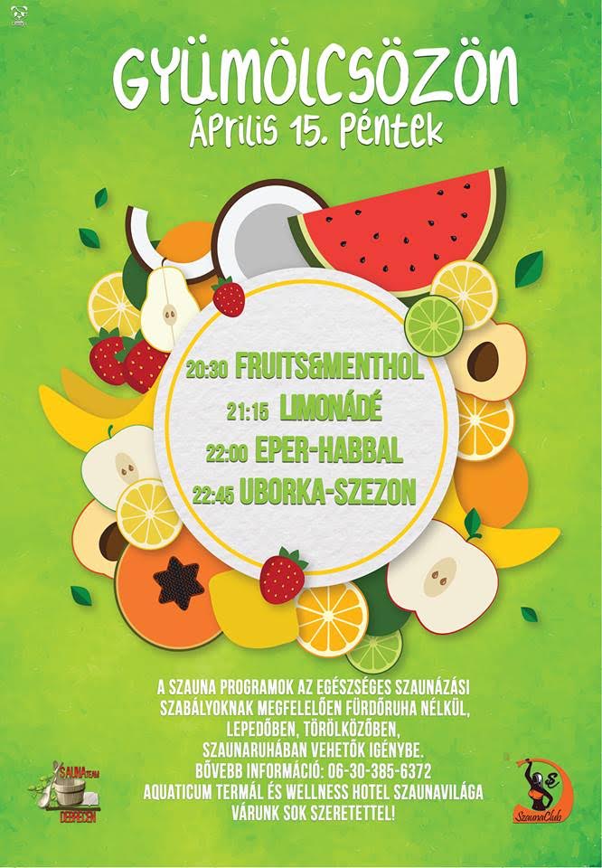 Skita Peti mentás-gyümölcsös aromás felöntésével indul az este, ami után gyümölcstálat szolgálnak fel a szaunakertben.
