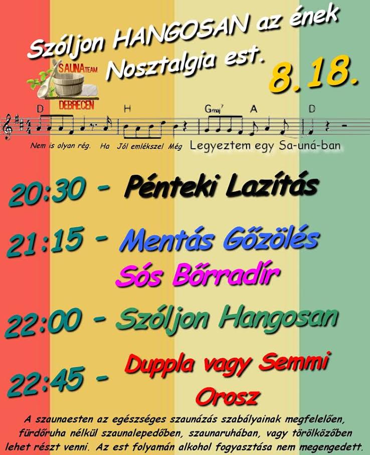 Pénteken magyaros est és gőzölés a Szaunavilágban Wellness augusztus 16, 2017Szabolcs SzilágyiSzóljon hozzá a Pénteken magyaros est és gőzölés a Szaunavilágban bejegyzéshez Pénteken magyaros esttel és gőzprogrammal is vár az Aquaticum Szaunavilág. Tetszett? Oszd meg másokkal is!